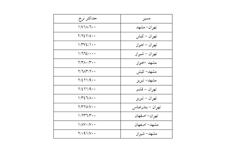 حداکثر نرخ فروش بلیت هواپیما در کلاس عادی- فقط یک طرفه مسیر رفت یا برگشت تا پایان فروردین 94