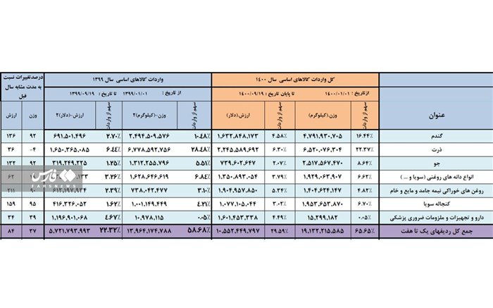 سال 99 در همین مدت 5.7 میلیون تن کالای اساسی وارد کشور شده بود که از نظر وزن 37 درصد و ارزش 84 درصد رشد کرده بود.