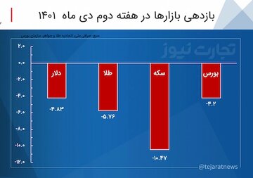 در میان بازارهای سکه، طلا و دلار بازدهی بازار سکه با افت ۱۰/۴۷ درصدی بیشترین سقوط را در میان بازارهای سرمایه به خود اختصاص داد. پس از آن نیز طلا با ۵/۷۶ درصد بازدهی منفی و دلار با ۴/۸۳ درصد بازدهی منفی قرار دارند.
