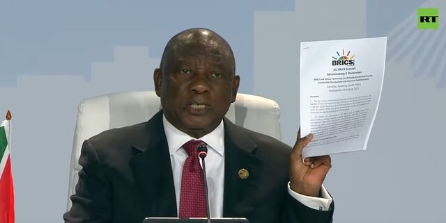 رئیسجمهوری آفریقای جنوبی گفت: رهبران بریکس معتقدند زمان استفاده از ارزهای محلی و سیستمهای پرداخت جایگزین فرا رسیده است. همچنین اعلام میکنیم که آرژانتین، مصر، ایران، اتیوپی، امارات و عربستان سعودی به بریکس دعوت خواهند شد.
