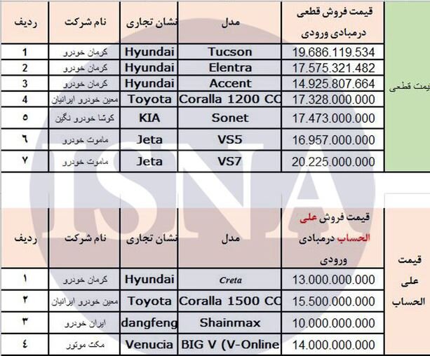 طبق آخرین اصلاحیه صورت گرفته، خودروی جتا VS۷ و جتا VS۵ با قیمت قطعی در مبادی ورودی و ونوسیا Big V (V-Online) با قیمت علیالحساب در مبادی ورودی به هشت محصول قبلی اضافه شده است.
