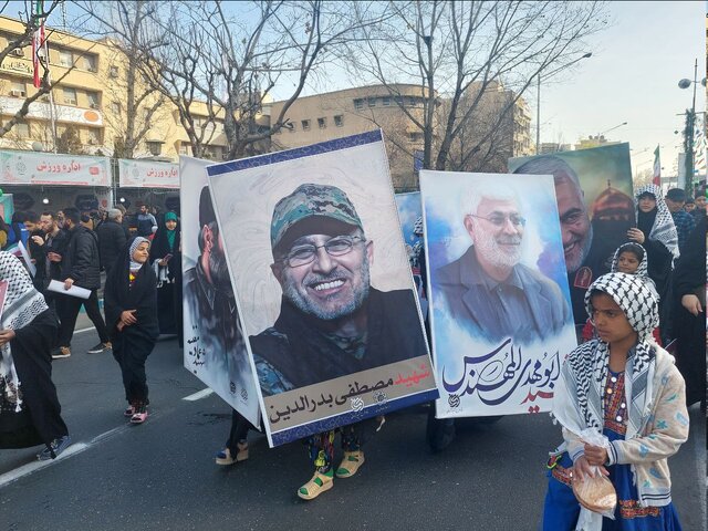 تصاویر شهدای انقلاب و جبهه مقاومت در دستان دهه نودیها در راهپیمایی ۲۲ بهمن قرار دارد.