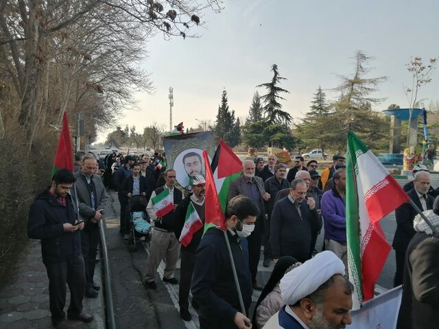 راهپیمایان تصاویری از حضرت امام خمینی(ره) بنیانگذار انقلاب اسلامی ایران، سردار شهید سلیمانی، حضرت آیتالله خامنهای رهبر انقلاب اسلامی و پرچم ایران را در دست دارند.