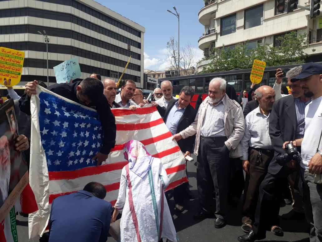 در ادامه نمازگزاران با به آتش کشیدن پرچم آمریکا خشم خود را نسبت به بدعهدی و خروج یک جانبه آمریکا از برجام نشان دادند.